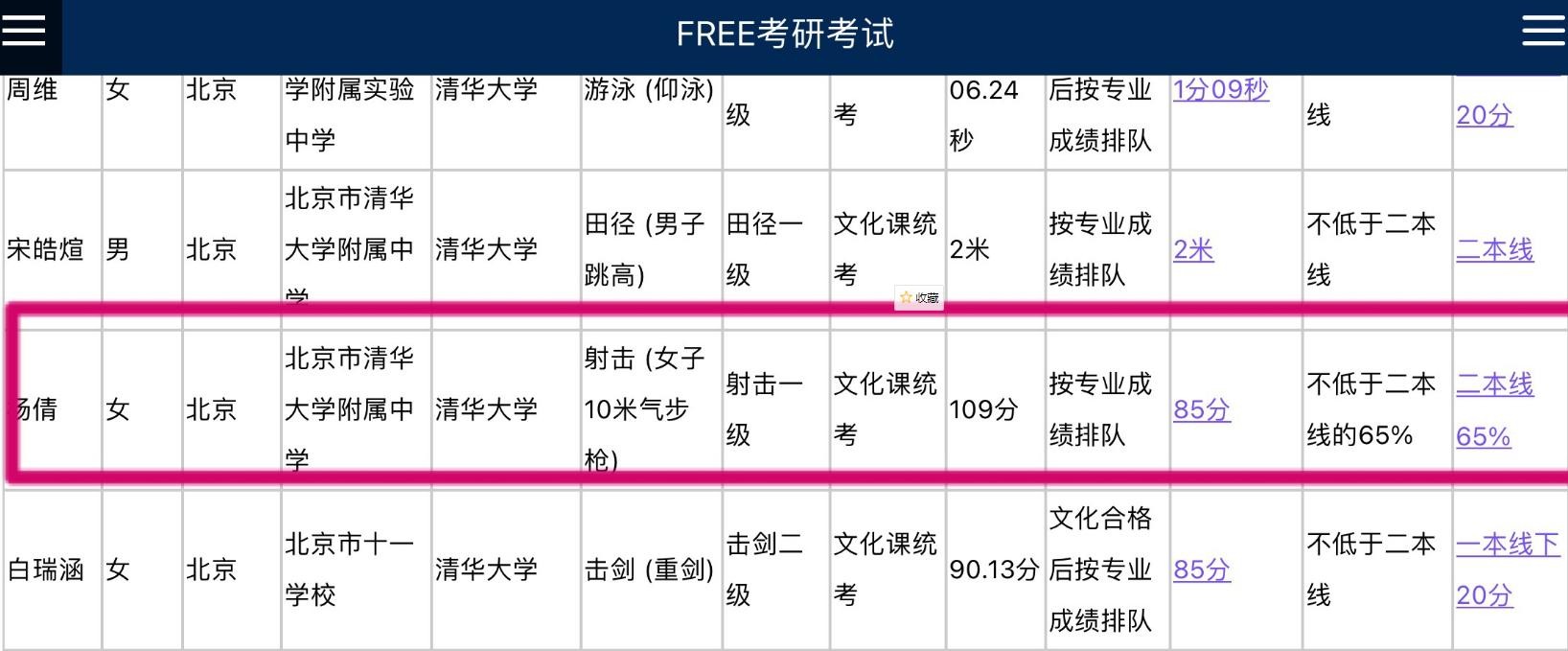 毕竟清华是国内顶尖学府,即使是对体育生来说分数也是一道“硬门槛”。无论你的体育成绩再好,如果文化课分数不过关的话,也是无法被清华录取的。