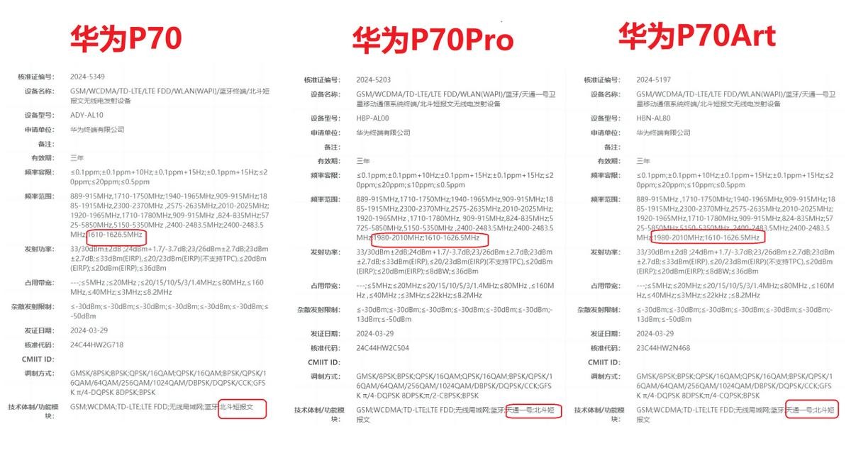 华为P70系列入网信息显示,将推出标准版P70、高配版P70 Pro以及限量珍藏版P70 Art三款机型。从支持的网络频段看,三款机型都支持4G,但并未看到明确的5G频段。其中,P70标准版支持北斗卫星导航,而Pro和Art版本则增加了卫星通信功能。