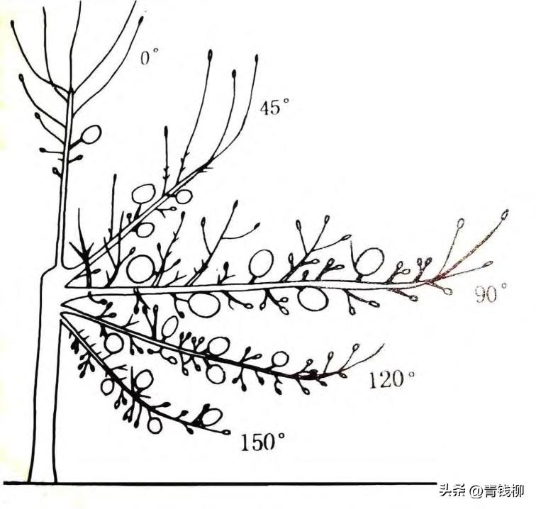 (1)拉枝角度:要依据海拔拉枝,海拔越高,树体长势越弱,拉枝角度要小。一般海拔 800 米以下的应拉枝为 120°~130°,海拔 800~1000 米的应拉到 110°~120°,海拔 1000 米以上可拉到 100°。有水浇条件的地、旱地拉枝有所不同,土壤瘠薄、肥水条件较差的地区,拉枝角度就要小些,可采用斜向上的角度,不要拉成负角度。灌水条件好的拉枝角度应大一些。树势不同拉枝角度不同。对于枝条基角较小、势力较强、延伸较长的枝,则要拉得大一些,一般拉成负角度。双矮短枝型树拉得小一点(图 5)。衰弱树不能拉枝,应加强肥水管理返旺后再拉枝。如果苗圃分枝角度较水平,可以不进行拉枝。