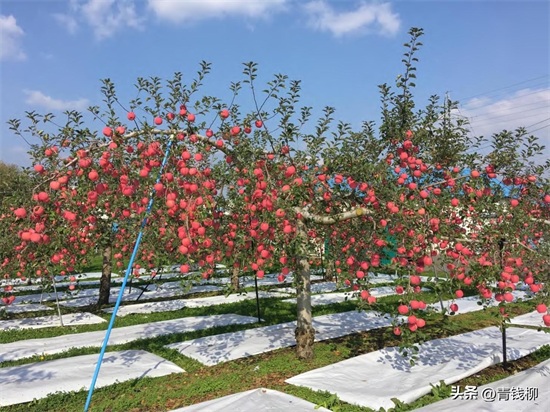 日本目前以乔化稀植栽培为主(图 2),老龄乔化苹果抗风、雪能力比矮化强,故老园寿命较长。矮砧栽培为日本苹果发展的方向,现在新建幼树主要发展矮砧苹果,砧木以 M9 和 M26 为主,矮化新建果园,株行距 2 米×4 米或 2.5 米×5 米,每亩栽植84~53 株,以细纺锤树形为主。每株结 150 个果实,每亩产量 3000~3500 千克。矮化果园,树龄过大、过密,应及时进行间伐,维持纺锤形树形。