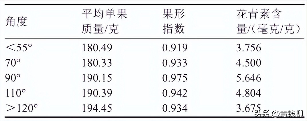 (2)拉枝开角:丰产不丰产,开角是关键。拉枝是高纺锤形整形的又一个主要技术措施,高纺锤树形的主枝角度在 110°~140°。如何开角?从 5 月上中旬开始,对长度长 25~30 厘米的主枝或者未到位的多年生主枝及延长头角度变小的主枝要继续开张角度达到目标要求。对于新梢可采用多次拉枝,5—6 月份拉基角,秋季用开角器或拉膜拉腰角。将中干上的新梢拉至 95°~120°。拉枝时枝条短的、易成花的品种角度可拉小一点或推迟拉枝时间,枝条长的、难成花的品种角度可拉大一点。角度对果实品质有一定的影响,随着主枝角度的增大,果实外观品质(平均单果质量、果形指数、果实色泽)和内在品质(硬度以及可溶性固形物、总糖、总酸、维生素 C、蛋白质、果胶和果实钙含量)均有不同程度的提高。主枝拉枝角度红富士以 120°、嘎拉以 90°~110°为好。见表 3、表 4。