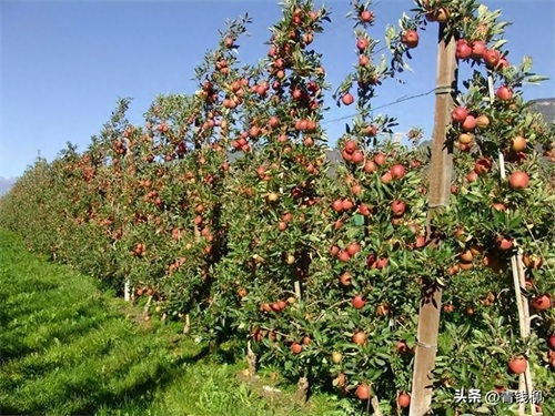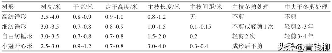 在国内矮砧苹果园推广最多的是细纺锤形和自由纺锤形;在国外,推广最新的是高纺锤形。