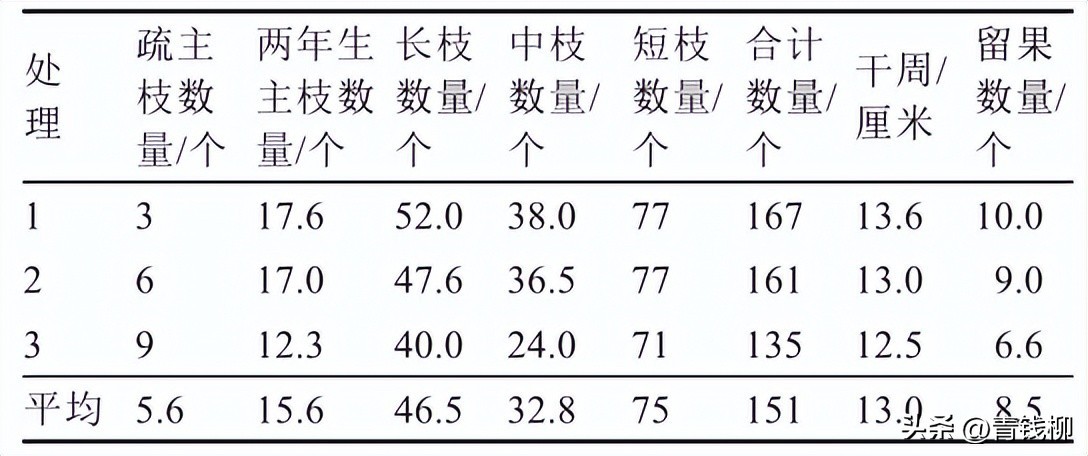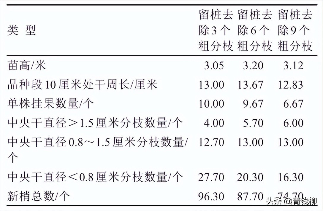 自根砧 M9-T337 红乔纳金第一年冬季剪光干(剪除所有分枝)与未剪比较,剪光干大枝多,生长旺盛,但 2~3 年内单株产量低。未剪光干者,当年单株产量是剪光干者的 8 倍,且细枝条多,冬剪去枝少。自根砧 M9-T337 第一年冬季进行留桩去除 3、6、9个分枝处理,发现去除枝少的,第二年单株挂果多,全树总枝量多,大枝少。去除枝越多,挂果越少,总枝量少,大枝多(见表 7)。
