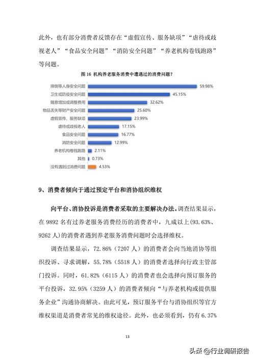 机构养老中,超过59%的消费者反映存在摔倒事故问题,45.15%的消费者提到卫生或防疫安全问题。此外,随意收费和设施管理不规范也对消费者信任度造成了影响。