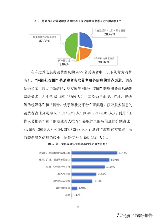 报告显示,67.42%的消费者通过社交媒体获取养老服务信息,而政府官方渠道的占比仅为8.4%。这表明官方渠道在信息传播中的影响力不足,可能限制了优质服务的触达。