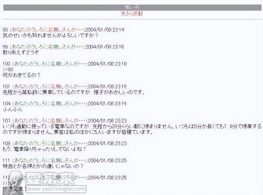 随着时间越来越晚,莲实仍不断在2ch上与网友聊天,她在凌晨2时留言说,附近传来铃铛及太鼓的声音,还出现一名单脚的阿伯。网友们顿时惊觉不对,叫莲实迅速顺着隧道,离开车站周围;莲实在走出隧道后,果然碰上其他人,而对方还好心表示,愿意免费载他一程。