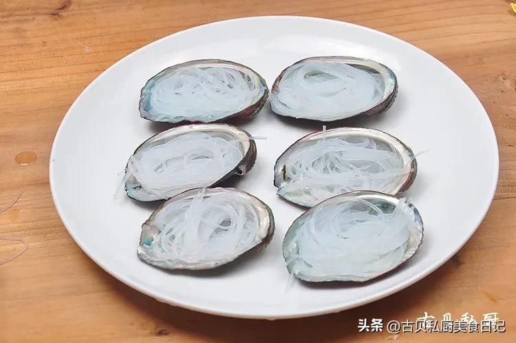 8、在洗好的鲍鱼壳里放入泡好的粉丝。
