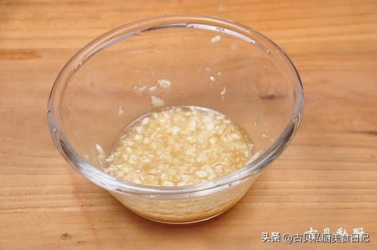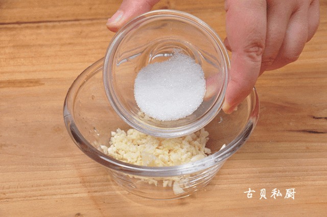 6、将蒜蓉放入碗中,加入盐、白糖、白胡椒粉和少许的清水。