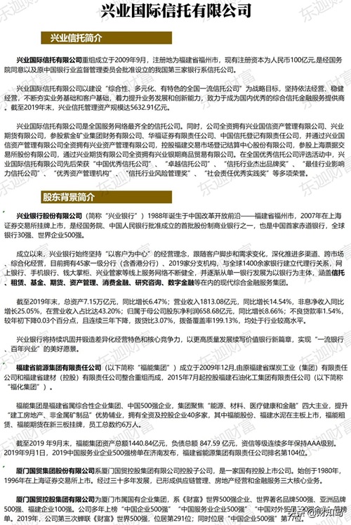 兴业信托背靠兴业银行,已发展为我国最大型的信托公司之一。有着强大的资产处置能力和完备的风险控制制度。