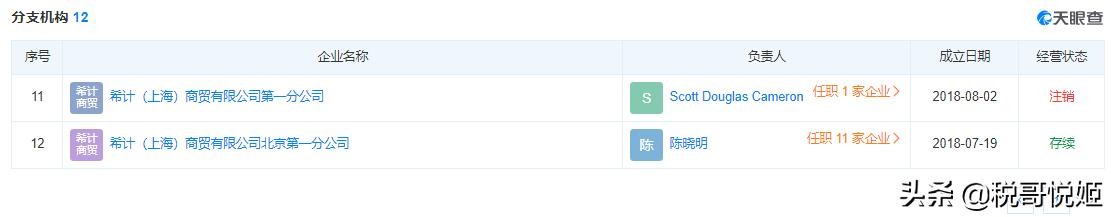 根据天眼查工商信息显示,希计(上海)商贸有限公司中国大陆共有合法注册的分支机构11个(共12个分支机构,其中一个已经注销)。