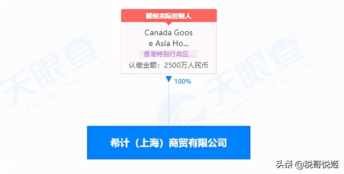 “加拿大鹅”通过子公司“亚洲加拿大鹅香港公司(英文名:Canada Goose Asia Holdings Limited)”控制中国公司“希计(上海)商贸有限公司”在中国开展服装销售业务。
