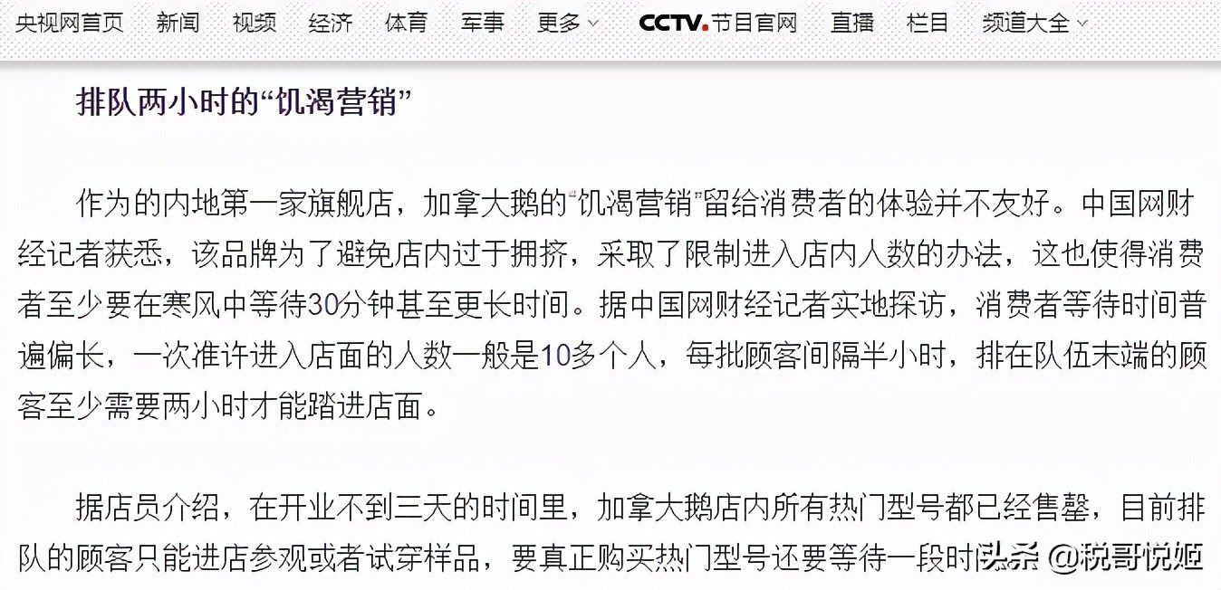 2019年1月2日,央视网曾报道“加拿大鹅”饥饿营销,限制10人进店,让消费者在寒风中等待30分钟至2小时;即便是进店了,也仅是参观或者试穿样品,真正购买热门型号还需要等待一段时间。