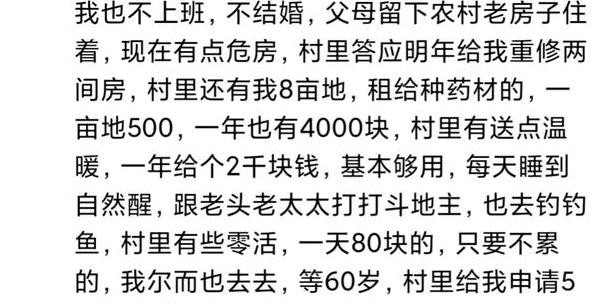 村里答应明年给我重修两间房,村里还有我8亩地,租给种药材的,一亩地500,一年也有4000块。村里还会给一些补贴,每年有2千块钱。这样的收入已经足够他们基本生活需求。每天起床自然醒,打打斗地主,钓钓鱼,生活充实而又自在。