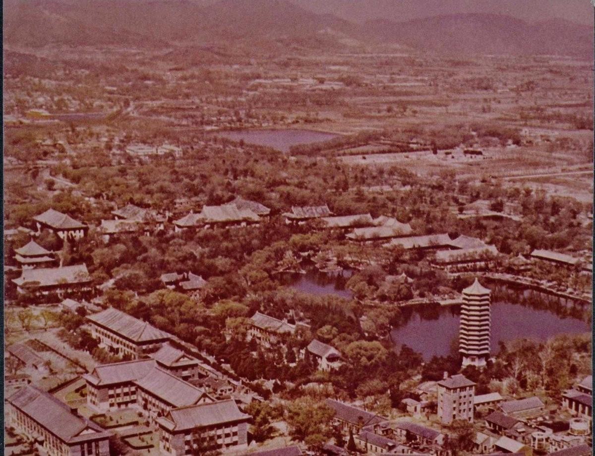 1964年,鸟瞰北京大学校园。可见已经消失的扇子湖。扇子湖左边建筑是西苑医院。右边空地是东北义园。