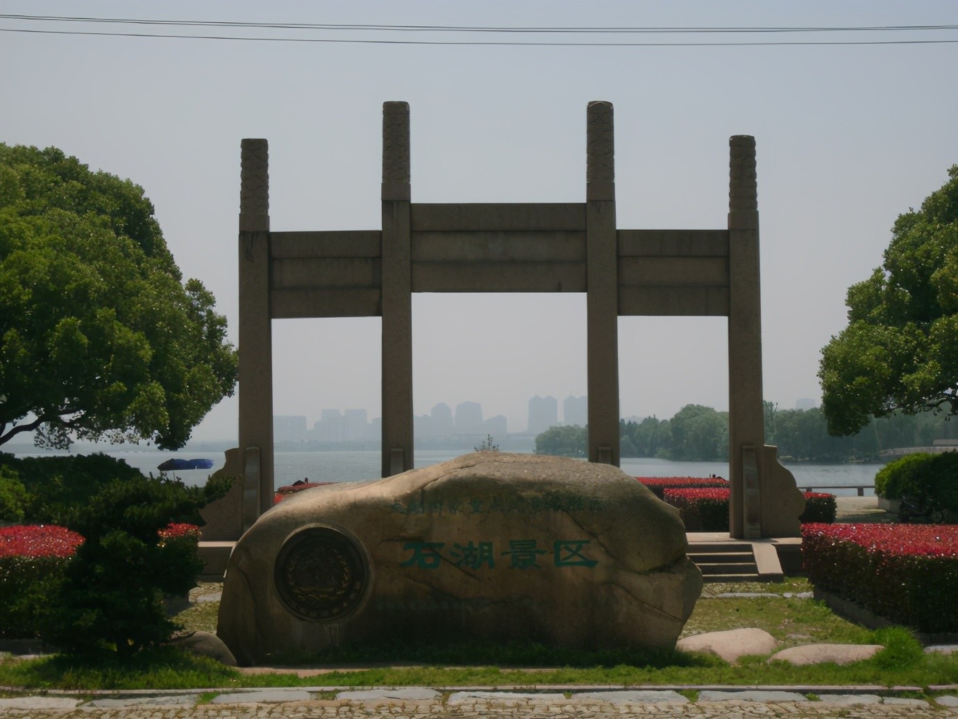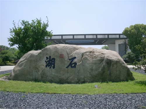石湖风景区北门入口。门前卧有一块巨石,上书“石湖”二字,虬劲有力,为乾隆所题。