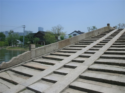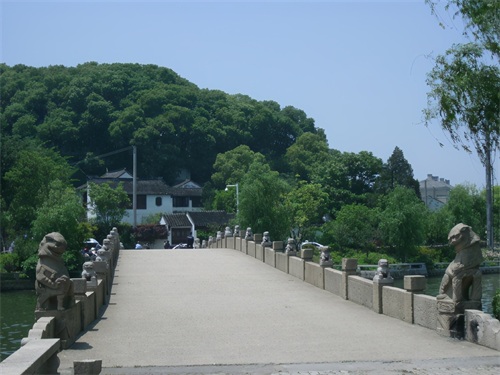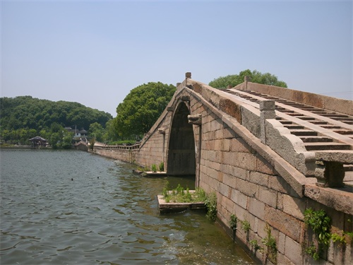 眼前就是行春桥。行春桥横跨石湖北渚,西连上方山茶磨屿东,是一座半圆拱薄墩九孔连拱石桥。