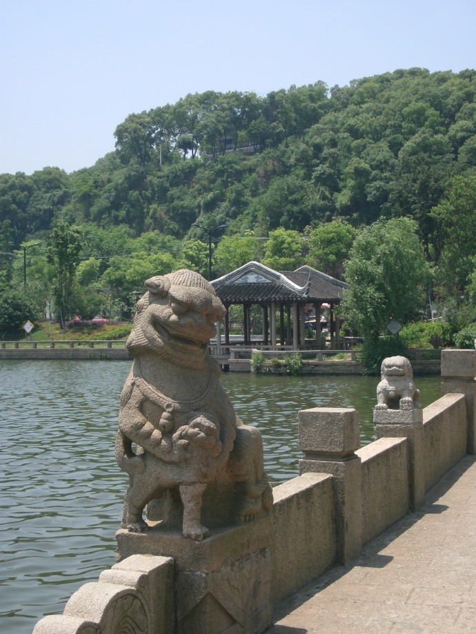 东桥堍立有两只石狮,张牙舞爪,很是可爱。桥栏杆上间隔着雕刻有狮头,桥墩侧面也镶有石雕狮头,形象逼真,雕工精细。