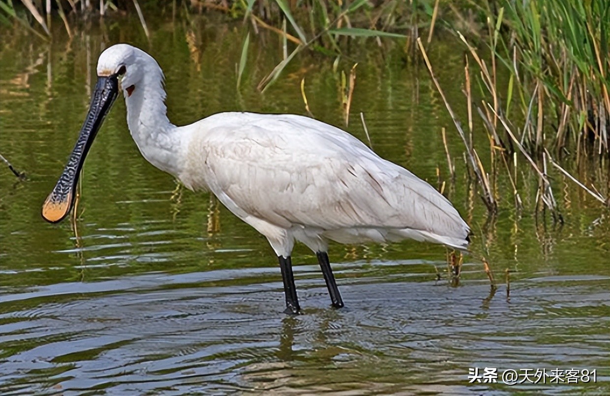 白琵鹭(学名:Platalea leucorodia)是大型涉禽。全长85厘米,全身羽毛白色,眼先、眼周、颏、上喉裸皮黄色;嘴长直、扁阔似琵琶;胸及头部冠羽黄色(冬羽纯白);颈、腿均长,腿下部裸露呈黑色。