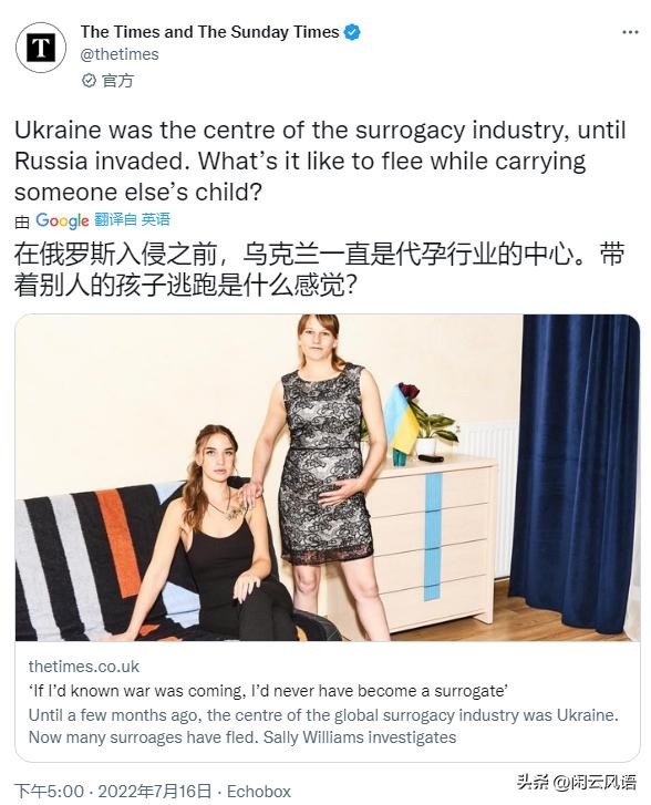 《泰晤士报》和《星期日泰晤士报》甚至还发文,探讨了在俄乌冲突之间这些乌克兰代孕的孕妇躲避战火的问题。