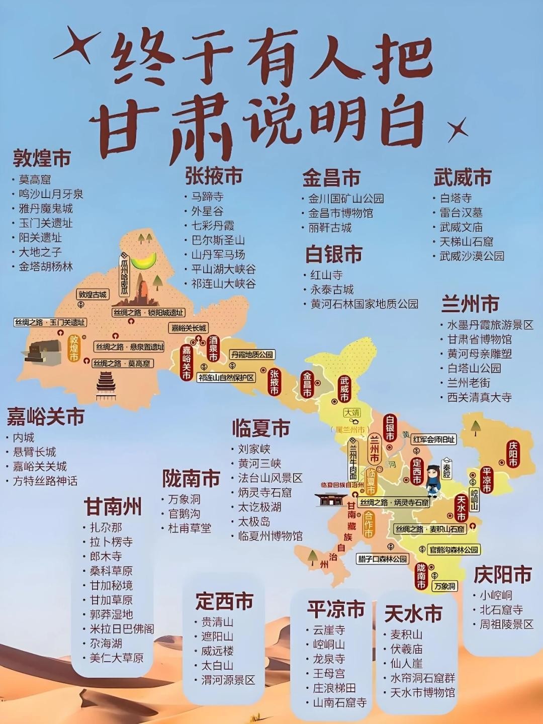 ✅最佳时间:5-10月,此时甘肃的气候适宜,敦煌莫高窟、张掖七彩丹霞等景点的景色壮美,能充分领略大西北的独特风光。