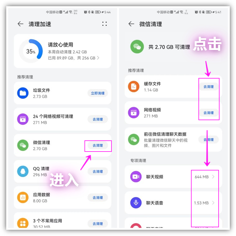 安卓手机都会自带一个手机管家,可以对微信进行深度清理,比如缓存文件,聊天视频、语音、表情,拍摄及保存的图片和视频。