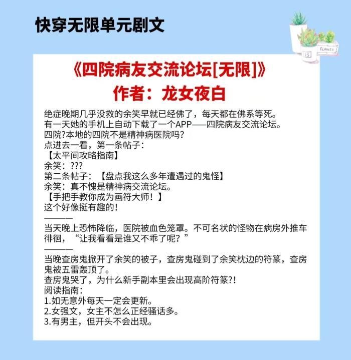 大家好,我是毛毛虫,本期分享4本快穿无限单元剧文,强推《四院病友交流论坛》,女主骚操作不断