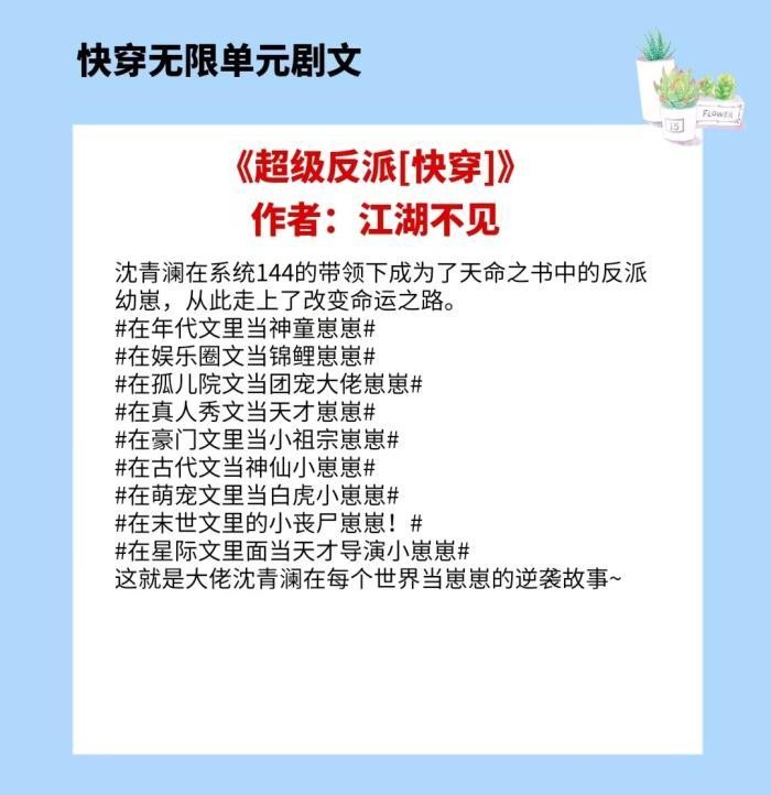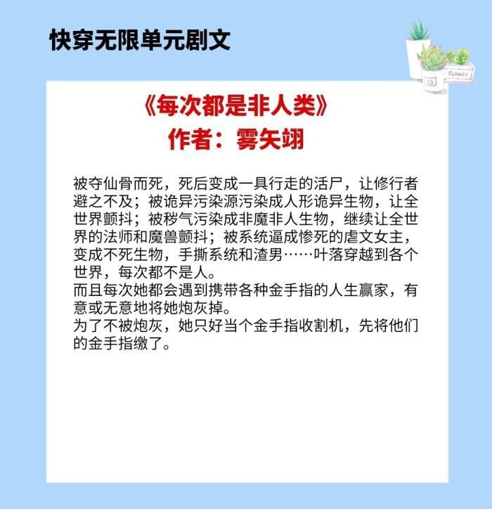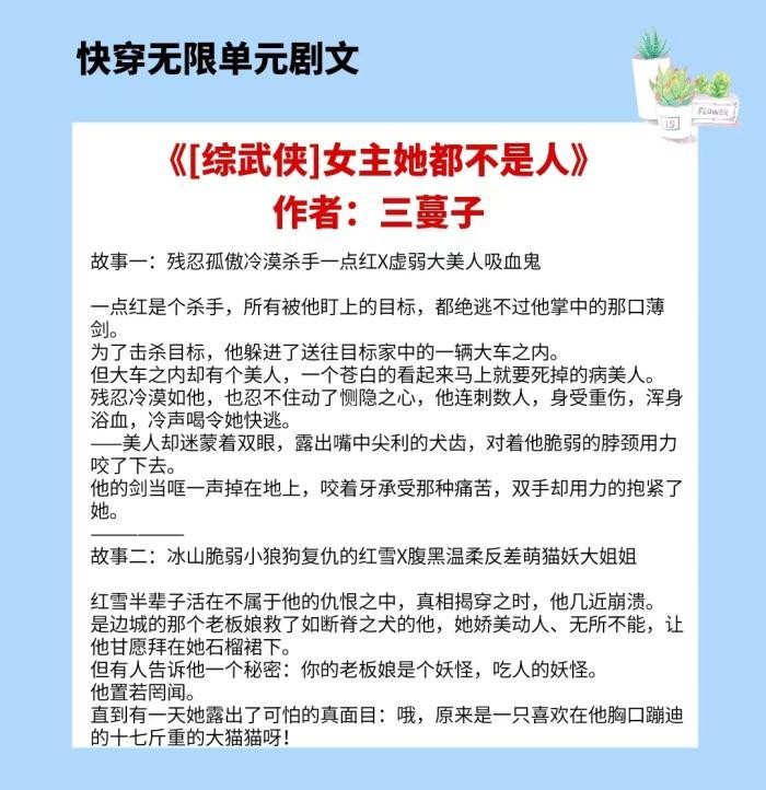 以上就是4本快穿无限单元剧文的全部内容,喜欢这一类型的书友们记得点赞和收藏啦,我们下期再见哦~