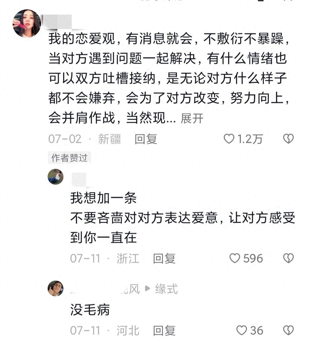 @autumn.:我的恋爱观,有消息就会,不敷衍不暴躁,当对方遇到问题一起解决,有什么情绪也可以双方吐槽接纳,是无论对方什么样子都不会嫌弃,会为了对方改变,努力向上,会并肩作战,当然现实中其实还蛮难遇到的。