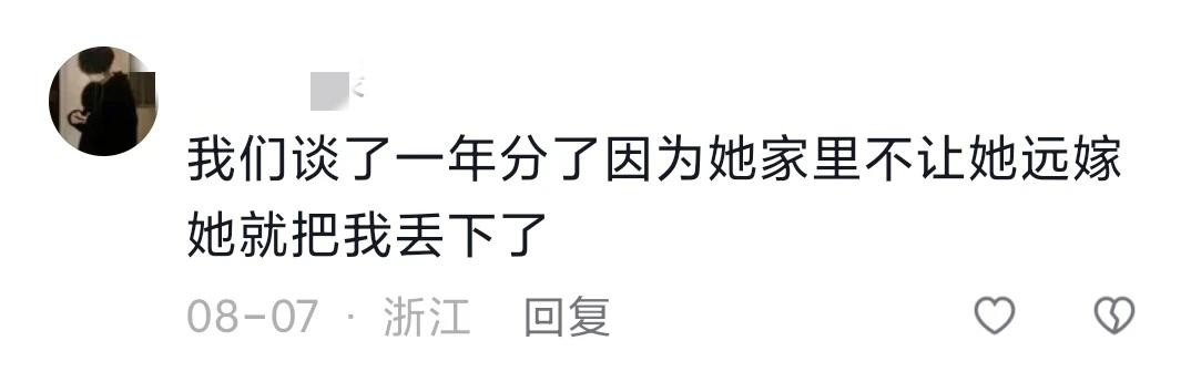 @眸似星辰:我们谈了一年分了因为她家里不让她远嫁她就把我丢下了。