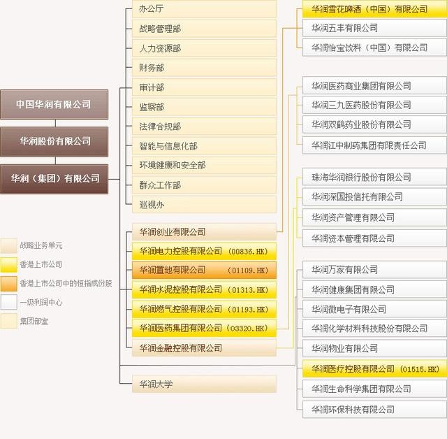 发展历程中的光辉战绩:1938年,华润的前身“联和行”在香港维多利亚湾畔悄然成立1938年,“联和行”积极配合宋庆龄领导的“保卫中国同盟”开展大规模抗日募捐活动1948年,“联和行”改组扩大为“华润公司”,钱之光先生任首任董事长1948-1949年,华润历经艰险将1,000多位民主爱国人士护送回国参加新中国第一届政协会议,共商建国大业1956年,华润参与组织了首届中国出口商品展览会(广交会前身)1978年,华润首倡“三来一补”模式并大力推广,开启了香港制造业向内地产业转移的先河1983年,“华润公司”改组为“华润(集团)有限公司”,开始建立现代企业制度1984年,第一家华润超级市场在香港开业1993年,华润收购沈阳雪花啤酒厂1994年,华润入股徐州电厂,拥有了第一个电力项目1998年,东莞华润水泥厂建成投产2002年,收购万佳百货,更名为华润万家,通过大规模开店和一连串的并购,逐步发展成在中国规模位居前列的超市集团2006年和2007年,华润分别重组华源集团和三九集团,在此基础上成立华润医药集团,打造民族医药平台2007年,华润燃气成立,并于2008年在香港成功上市2010年,华润对珠海市商业银行成功实施战略重组,并更名为珠海华润银行2015年,华润创业剥离非啤酒业务,更名华润啤酒(00291.HK)2016年,华润医药整体上市;华润注资凤凰医疗,后更名为华润医疗2016年,华润与麦格理联合收购澳洲最大癌症与心脏病治疗服务公司GenesisCare 61.7%的股权,并对新西兰的Comvita蜂蜜、Scales苹果、King Salmon帝王鲑鱼进行了股权投资2017年,华润电力及华润资本组成的联合体竞得英国Dudgeon海上风电场30%股权;华润置地联合体在英国成功签约收购位于伦敦的写字楼项目20 Gresham Street2019年,华润医药完成收购江中集团,更名为华润江中华润集团旗下业务: