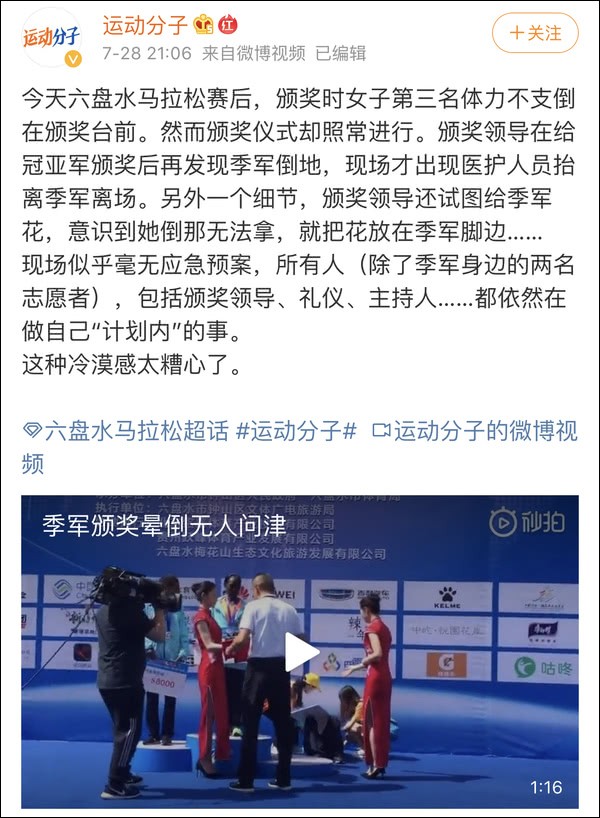 但在现场,当时目睹选手晕倒的场上人员被指仿若无事发生,继续仪式未上前协助,仅两名志愿者为选手扇风,颁奖嘉宾还将花束放置躺地选手的脚边,被不少网友怒斥“人心冷漠”。