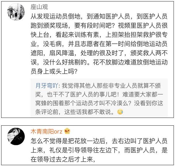 但场上除了志愿者以外,所有人都在按部就班走颁奖程序,没有对晕倒选手做出应对反应。