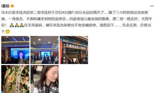 据爆料人称李连杰的亲二哥李连利于2月24日晚7:30分去世,这是李连杰5个兄弟姐姐中去世的第一个兄长,葬礼搞得非常隆重,灵前堆满了花圈。