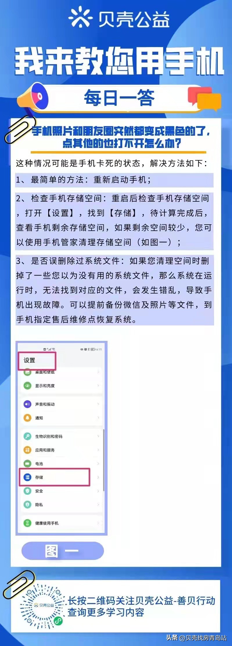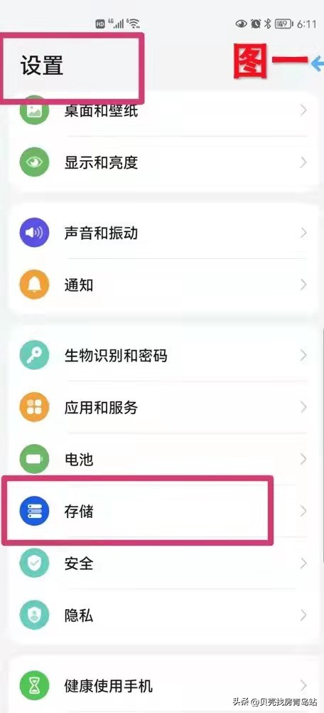 2、 检查手机存储空间:重启后检查手机存储空间,打开【设置】,找到【存储】,待计算完成后,查看手机剩余存储空间,如果剩余空间较少,您可以使用手机管家清理存储空间(如图一)