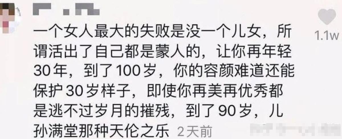 网友说她:“一个女人最失败的事情就是没孩子,等你到了90岁,还能保持少女容貌吗?”