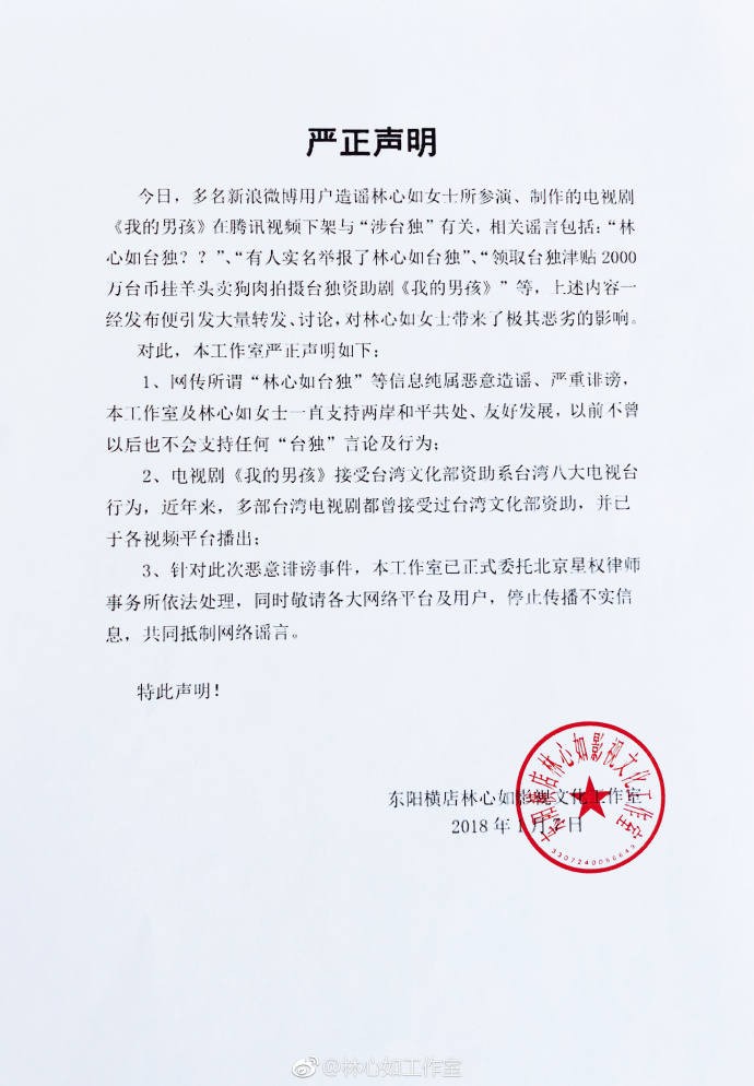 2017年12月底和2018年1月初,先后有两名网友向有关部门举报,林心如上映的电视剧《我的男孩》涉嫌台D。