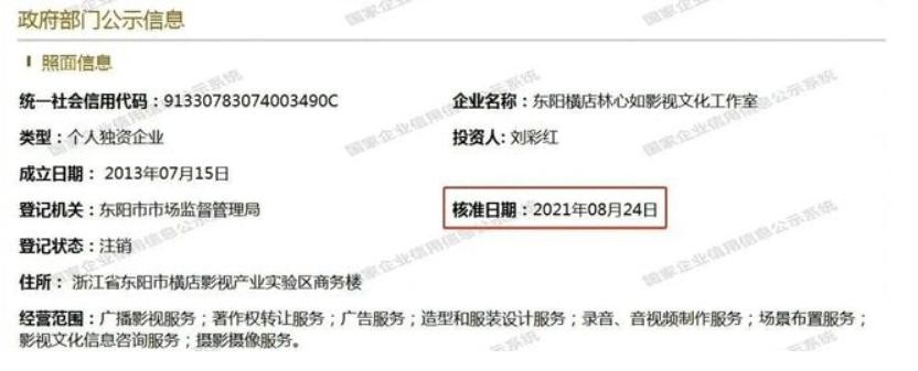 赵薇被消失那天,林心如的东阳横店林心如影视文化工作室,被曝出发生工商变更,企业状态由存续变更为注销。