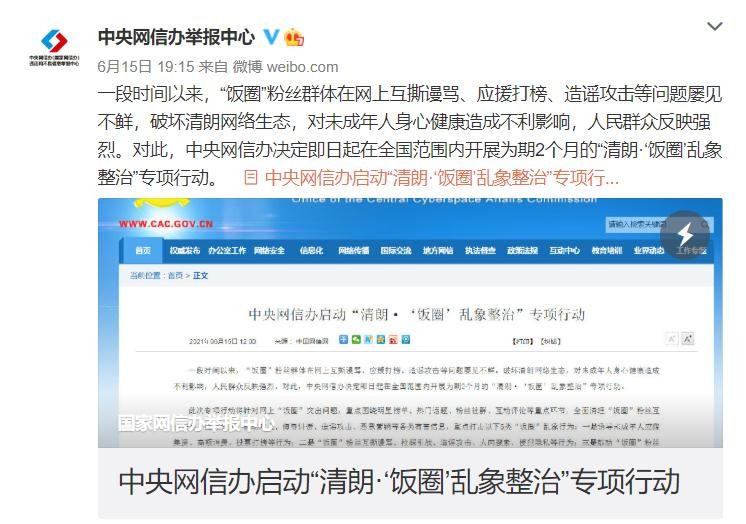 2021年6月15日,中央网信办启动“清朗·‘饭圈’乱象整治”专项行动。