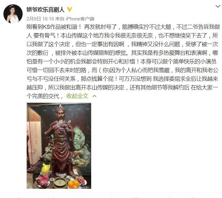 她说被本山传媒限制,连个小演出的机会都不给她,不在乎投资亏的那些钱,只在乎在舞台上表演,结果被压制,只能离开。