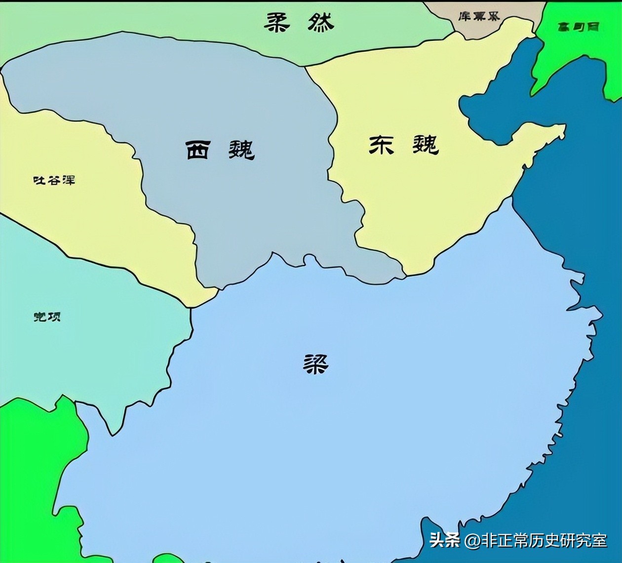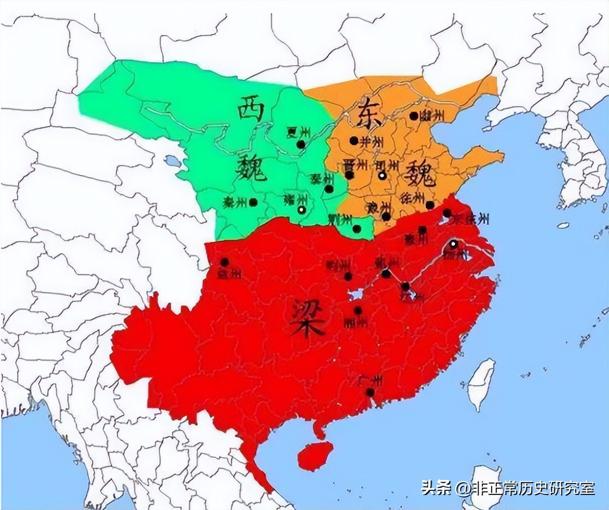 随之而来的就是北方几十年的内乱和农民起义,最终北魏分裂成高欢控制的东魏和宇文泰控制的西魏,互相仇视,南北对峙演变为三国鼎立,其中东魏势力最强,南梁地盘最大,西魏比较弱小,梁武帝似乎可以完成一统天下的夙愿了。