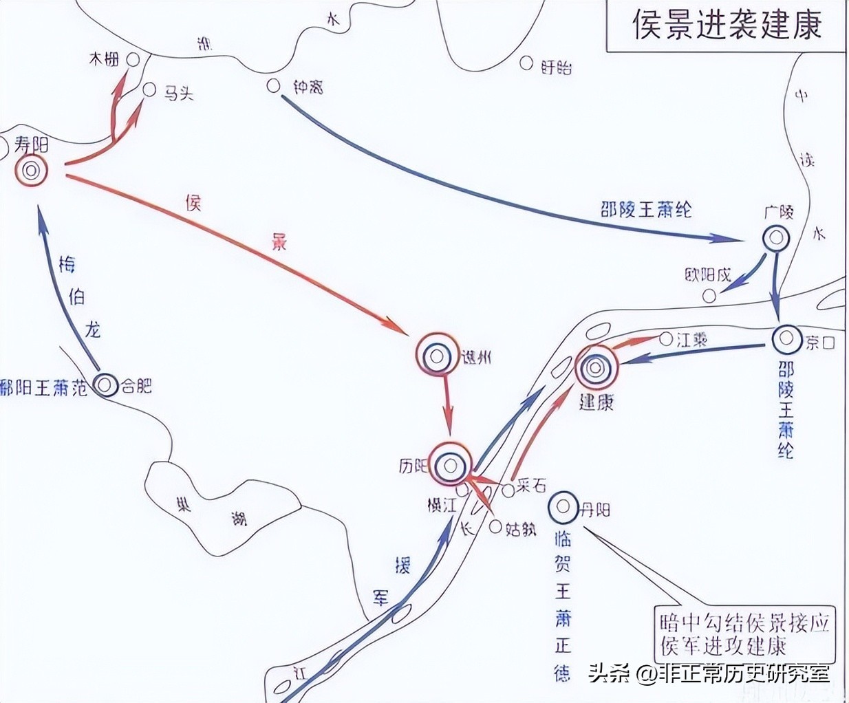 萧正德早就准备了几十艘大船以接应侯景大军渡江,并且将陈昕与防守长江南岸的采石驻军换防的消息透露给侯景,侯景成功渡江后快速到达采石,未做停留直接东上,兵锋直指建康。