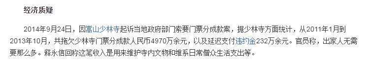 在外界看来,少林寺沾染太多“金银财帛”便是错误,释永信走商业化道路更是为了个人私利。