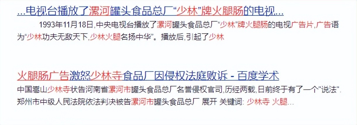 1993年,漯河的一家肉食厂,不仅把“少林”映在了火腿肠的包装上,还在电视上大肆做广告,“无数火腿肠从少林寺山门飞出”,为少林寺招致了社会上的不满和质问。