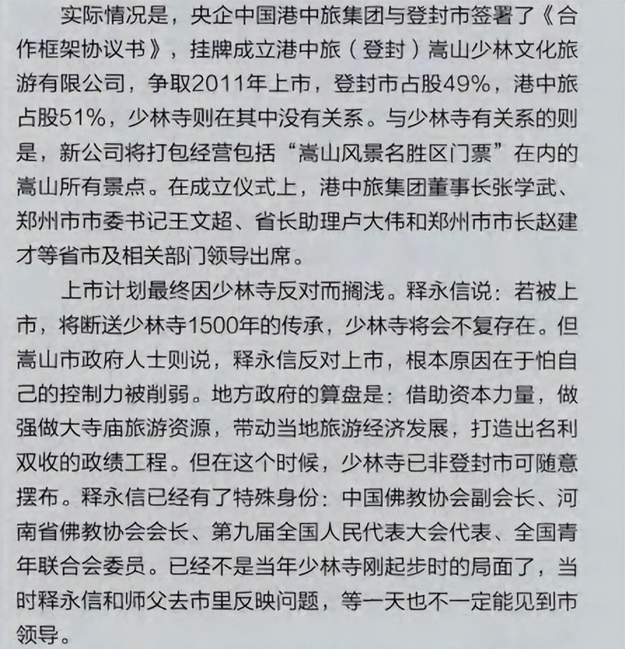 实际情况却是,所谓的“上市”是地方Z府和港中旅的计划,与少林寺并不相干,甚至释永信从“计划”一开始便坚决反对,觉得此事比1928年的那一把火还要严重。