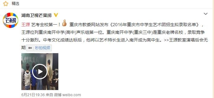 据6月16日公布的《2016年重庆市中学生艺术团招生拟录取名单》显示,在声乐组别中,王源位列重庆南开中学(高中)拟招收名单第一位。