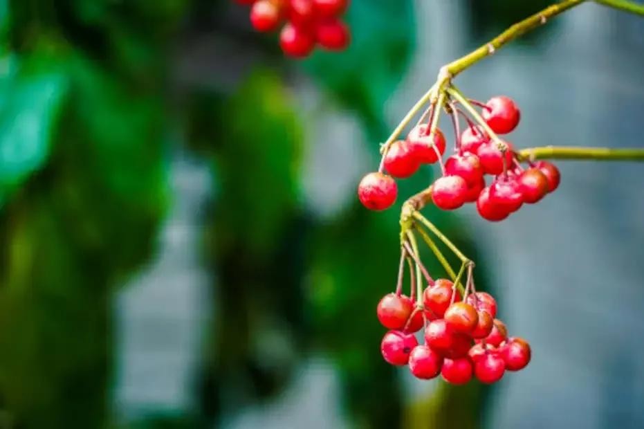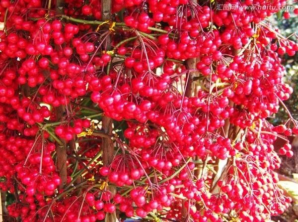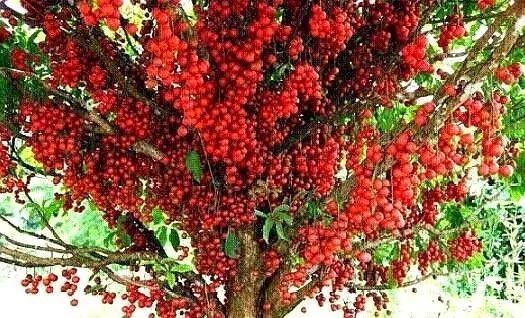 树上挂满了一串串红色的果实。红色外壳包裹着几颗黑色、略带油光的籽。在阳光的照耀下显得更加晶莹亮丽。