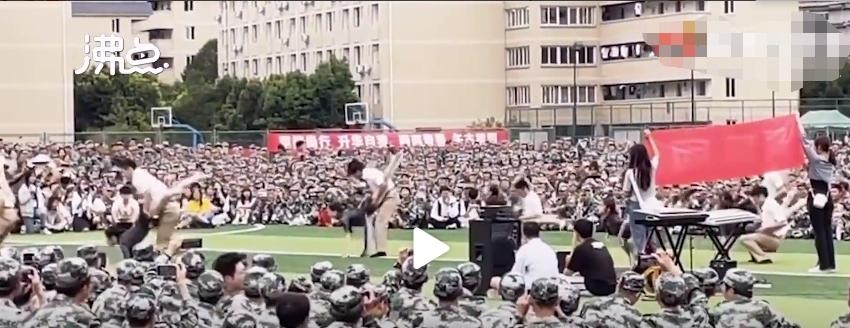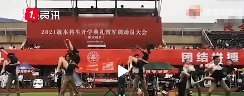 视频中,两边坐满了身着军训服装的学生,主席台背景板上有“开学典礼暨军训动员大会”的字样,几对男女同学在操场上翩翩起舞,女生们身穿旗袍,做出分腿、紧抱、劈叉等动作,被网友批评太性感,不适合出现在开学典礼和军训动员大会上。