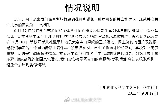 19日,四川农业大学官微发布情况说明,称该舞蹈系新生军训休息期间组织的一次小型演出,不是正式活动。这个舞蹈是学习的一个国内舞蹈比赛作品。学校对此高度重视,要求主管部门加强学生活动的管理和引导,组织开展丰富多彩、健康高雅的校园文化活动。学校将认真吸取教训,避免今后出现类似情况。