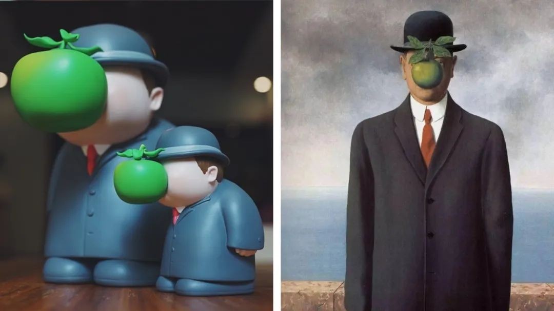 左:大橘子大艺术家系列《人类之子》手办,PVC,高约12cm;右:雷内·马格利特(René Magritte)《The Son of Man》,布面油画,116×89cm,1964年