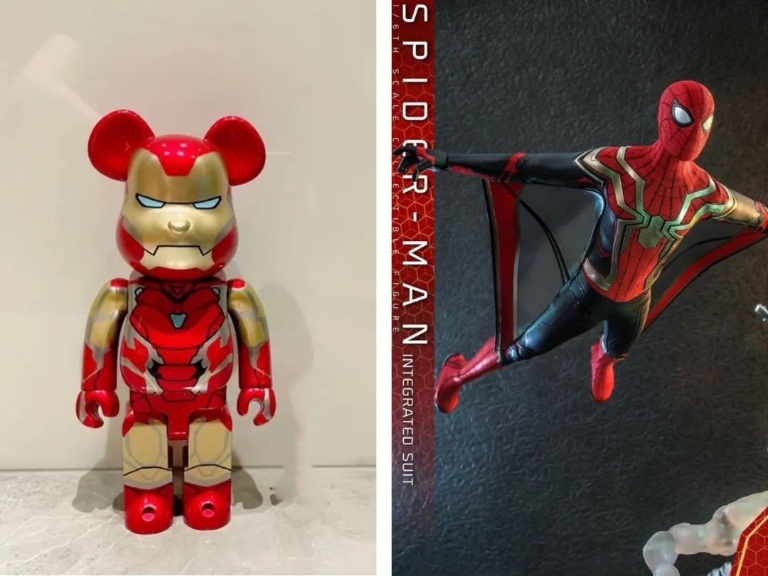 左(潮玩):BE@RBRICK蜘蛛侠系列;右(手办):Hot Toys《蜘蛛侠:英雄无归》1:6比例手办
